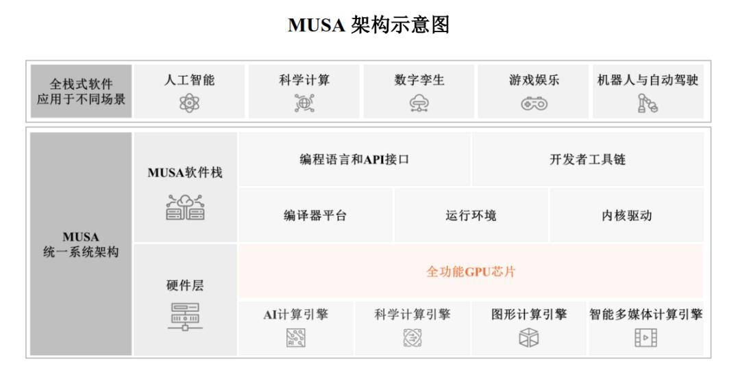 MUSA架构是公司自主研发的融合GPU硬件和软件的全功能GPU计算加速统一系统架构。该架构涵盖统一的芯片架构、指令集、编程模型、软件运行库及驱动程序框架等关键要素,旨在为各类并行计算场景提供高性能计算能力。