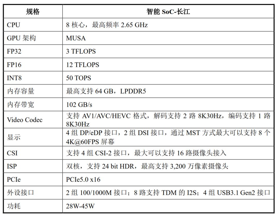基于MUSA架构,摩尔线程推出智能SoC芯片“长江”,这是集成了“全功能GPU+CPU+NPU+VPU”等异构算力单元的片上系统芯片。