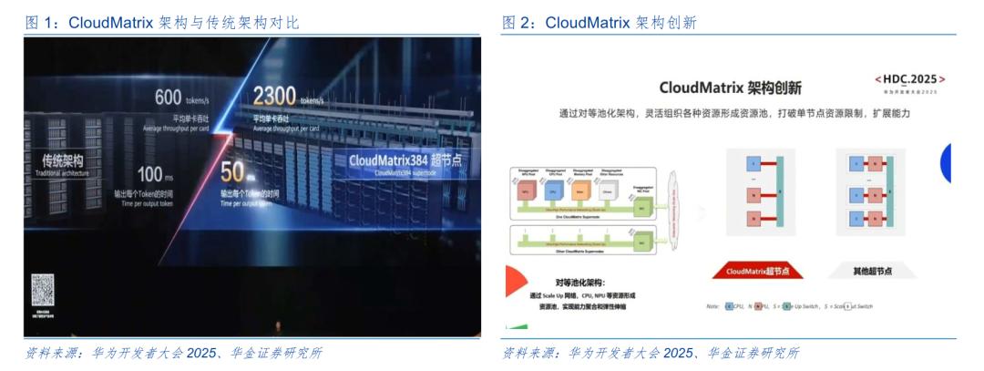 除兼容英伟达CUDA架构的摩尔线程MUSA架构外,国产算力还有一个绕不开的玩家就是华为,2025年6月20日,华为在开发者大会发布CloudMatrix384AI超节点,将384颗昇腾NPU和192鲲鹏CPU通过全新高速网络MatrixLink对等互连形成了一个整体AI“服务器”。算力已从单台的6.4pFLOPS提升至超节点300pFLOPS,算力提升50倍。单卡的推理吞吐量从每秒600tokens提升至每秒2300tokens,提升近4倍。