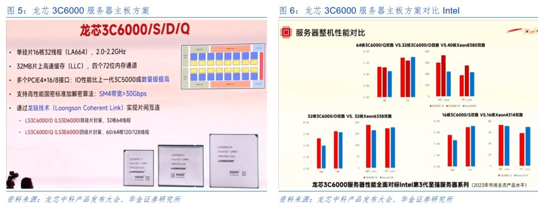 龙芯3C6000系列处理器具备高性能,高可靠,高安全,高能效的特点。本次产品主要打造了5种服务器主板方案(3C6000/S单路、双路;3C6000/D双路;3C6000/Q双路;3C6000/D四路)主要针对不同应用群体,服务器性能全面对标Intel第三代至强服务器系列,基本达到2023年市场主流产品水平,实测中64核心双路和32核心四路产品整机性能比较Intel的8380有小幅优势。