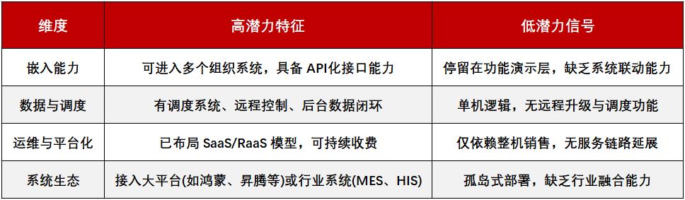 如果从“新型基础设施”这个视角切入,我们就能对机器人企业的长期价值进行更具判断力的评估。以下是一组可操作的判断标准:
