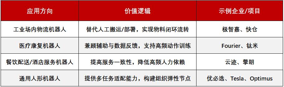 当前行业发展中,“具身智能”一词涵盖极广,既包括类人机器人,也包括具备感知、反馈和自动控制能力的智能移动终端。我们认为,如果从“组织可控性升级”的角度出发,更值得关注的方向包括: