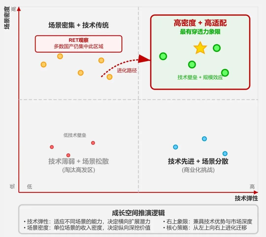 当前市场中,多数国产企业仍集中于“高场景密度+中低技术弹性”区间,这些企业具备确定性收益能力,但尚未具备跨周期的价值穿透力。
