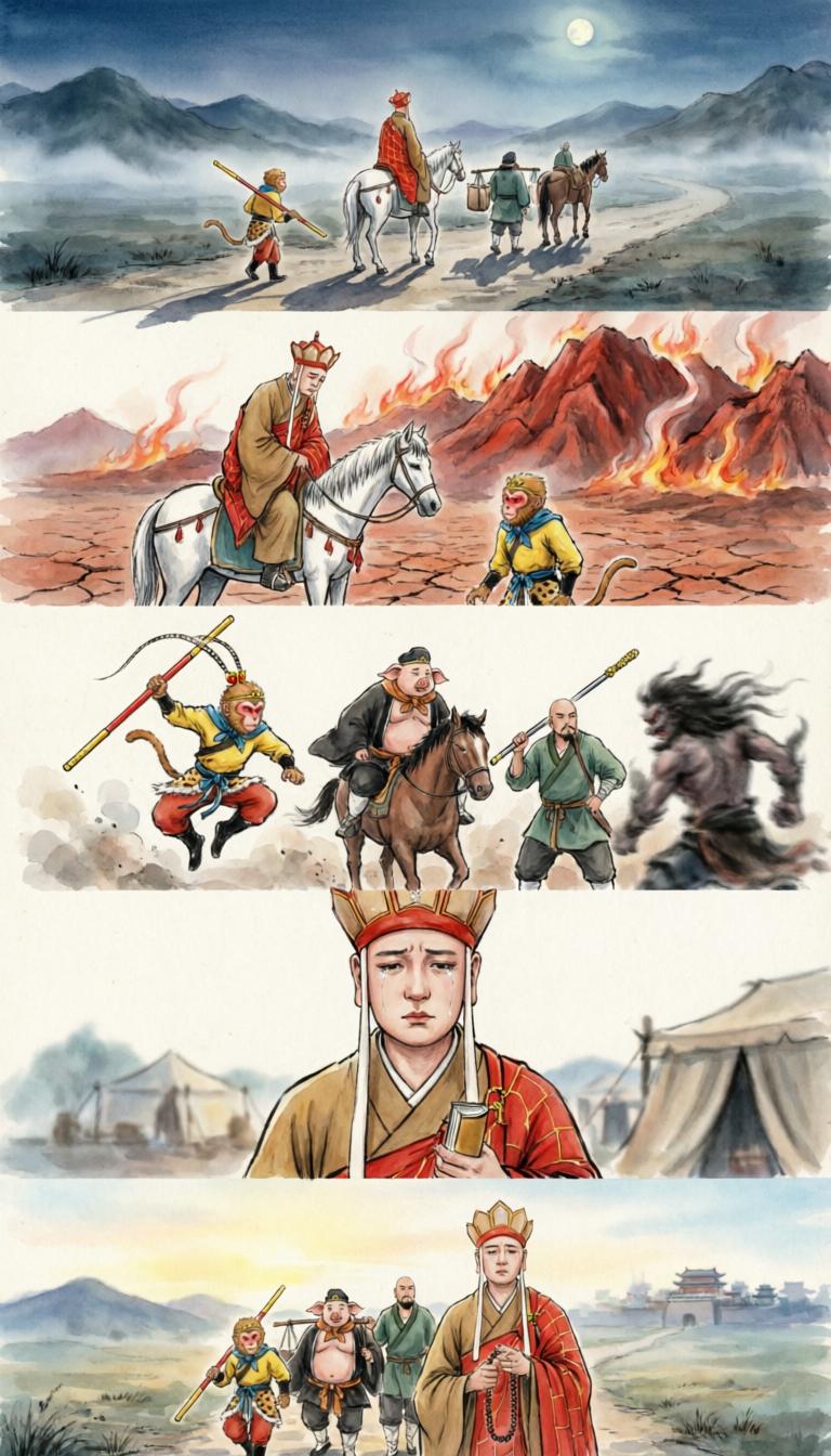 结果还没一分钟,Qwen-Image-2.0就给我搓出来了完成度明显高于我预期的唐僧师徒西天取经的「五宫格漫画」: