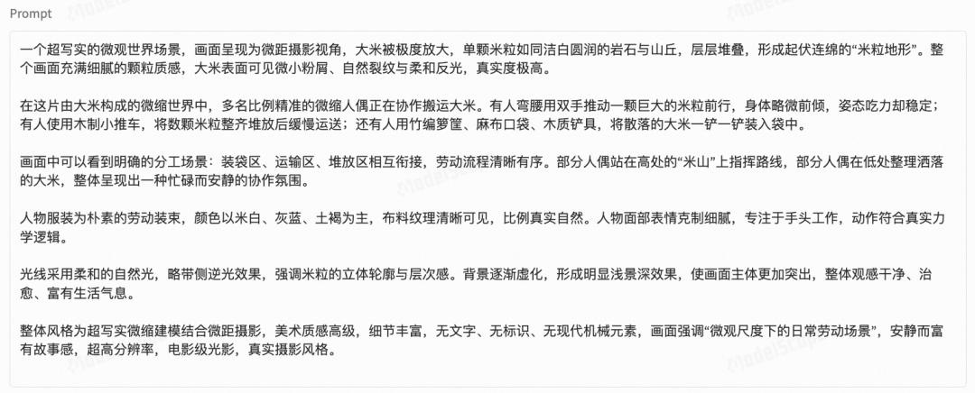在提示词的设计中,既要求AI将大米放大到地形级的尺度,又要保证微缩人物的比例、动作和受力逻辑真实,还得在同一画面中呈现搬运、装袋、协作的劳动场景,一旦有一项没对齐,画面就会立刻出戏!!!