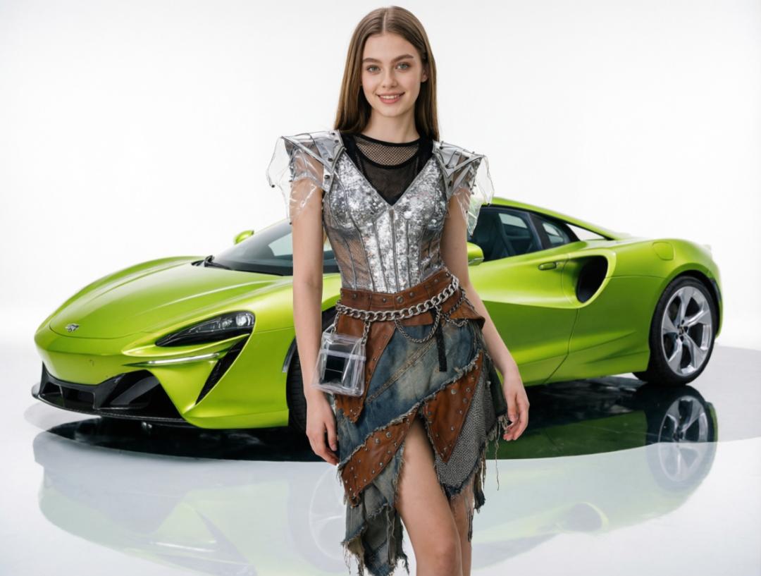 咱先来玩一个NanoBanana超火的OOTD拼图玩法,让图1中的女孩穿着图3的裙子,站在图2的车身前: