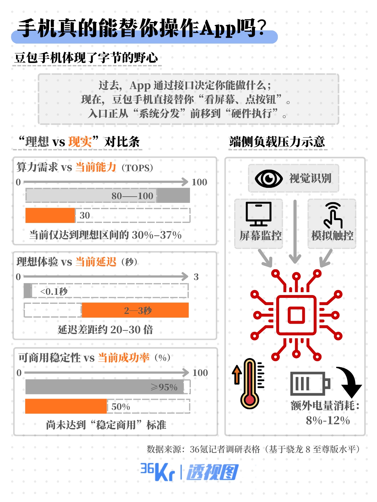 字节跳动选择了更直接的路径——不等待接口开放,利用视觉识别让 AI 自己“用App”。这验证了界面层接管的可能性,但在当前30 TOPS的端侧算力瓶颈下,跨应用操作仍面临延迟(约3秒)与成功率(约50%)的现实挑战。方向已验证,但摩尔定律还需要时间。