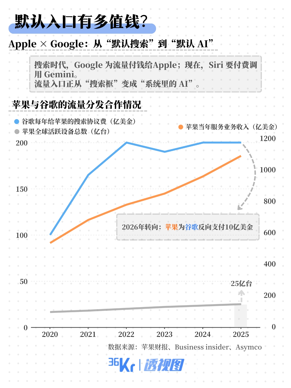 更深层的变化来自金钱流向。过去十年,Google每年向Apple支付约200亿美元保住“默认搜索框”;而据彭博社报道,未来Apple可能反向支付10亿美元以接入Gemini。 这意味着入口的定价权已变: 流量分发不再靠搜索框,而靠系统级AI。