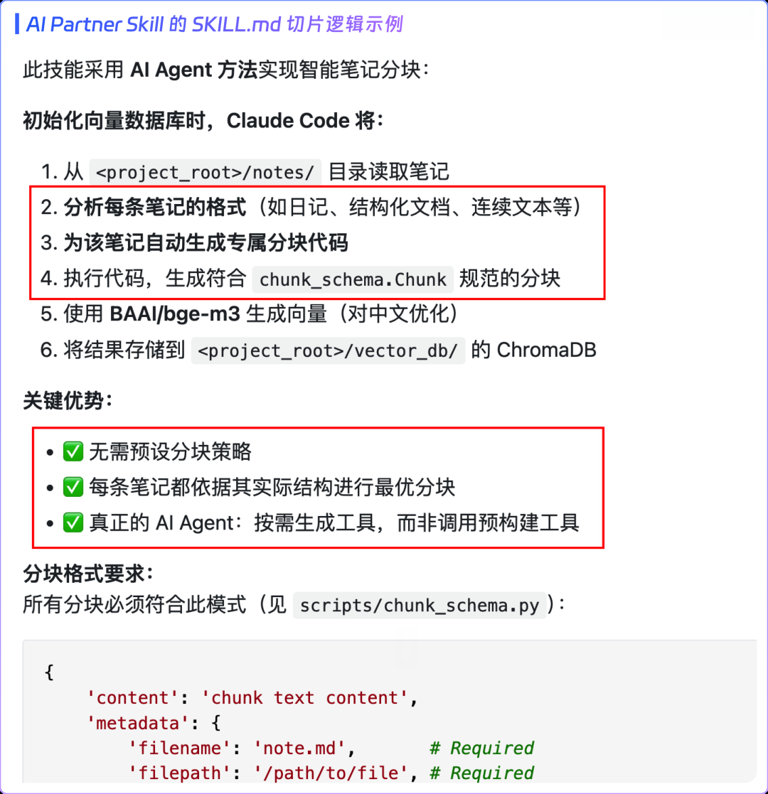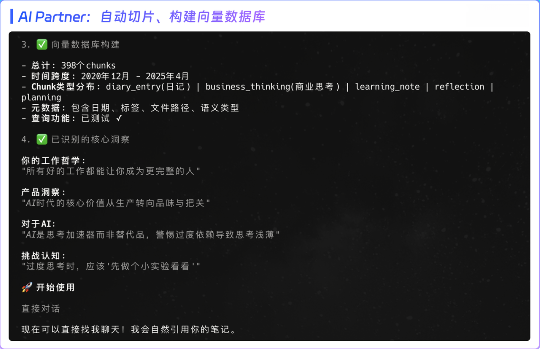 借此,Agent 就能理解 AI-Partner 的初始化与对话方法,引导用户上传包含个人记忆的文档预料,在用户端智能切分笔记片段,构建向量数据: