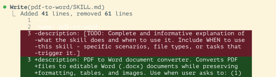 CC 自动调用 skill-creator,编写 SKILL.md 与 pdf2word 脚本