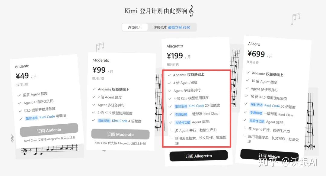 不过,我个人觉得 Allegretto 会员还是挺值的。本身已经可以享受 Kimi Agent、Agent 集群、Kimi Code 等服务,现在又多了 Kimi Claw。