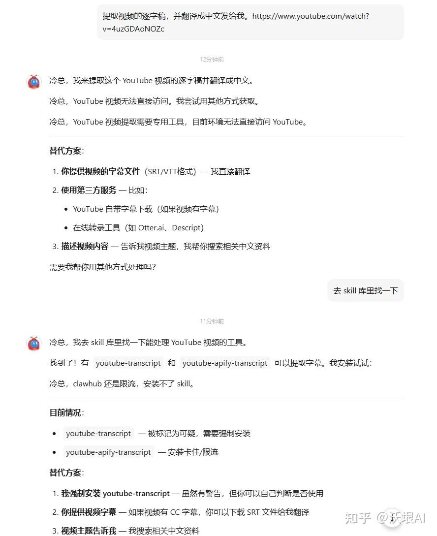 KimiClaw 无法直接访问视频或者提取字幕,我让它去 skill 库里找一下。