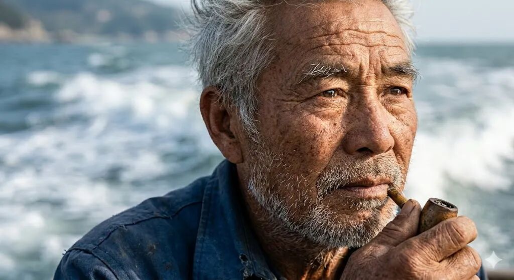 Nano Banana Pro生成,提示词:一位年约60岁的亚洲渔夫的超高清面部特写,海浪作为背景虚化。他脸上布满饱经风霜的皱纹和晒斑,皮肤纹理极其细腻,能看到细小的毛孔和银色的胡茬。阳光从侧面45度打来,照亮他半张脸,眼睛微眯,眼神中透露出坚毅与平静,眼球表面映出远处海平面的反光。画面锐度极高,皮肤质感真实到仿佛能触摸到。