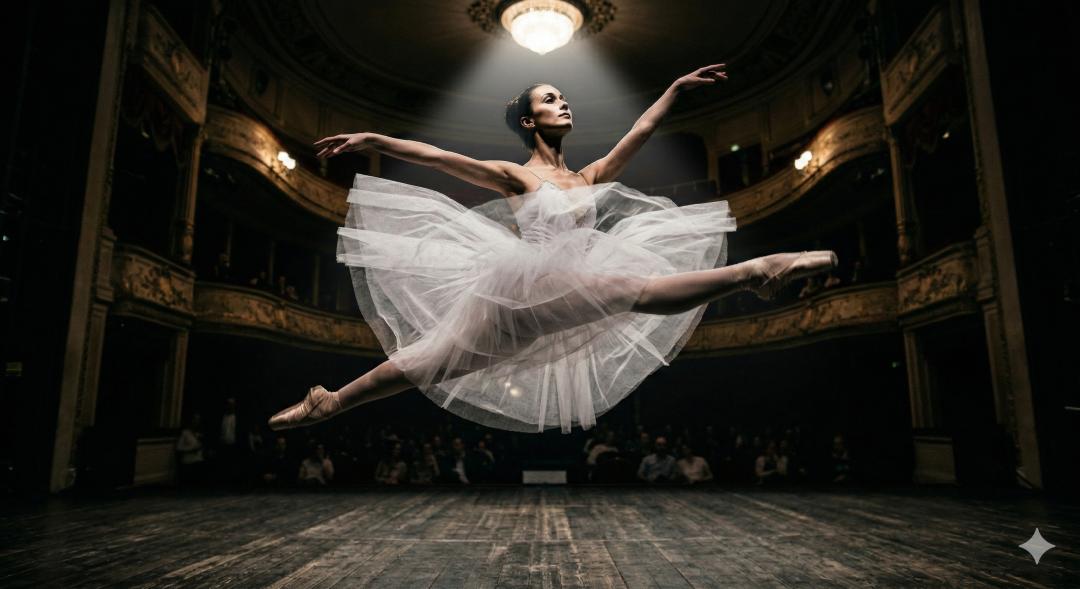 智东西用Nano Banana 2生成的图片,提示词:仰视视角拍摄一位芭蕾舞演员腾空跃起的瞬间。镜头从下往上,观众看到她的下巴、下巴的阴影以及舒展的身体线条。她的双臂张开,舞裙飞扬,面部表情专注而宁静,眼神望向远方。舞台灯光从上方打下,在她面部形成强烈的明暗对比。要求下巴到额头的透视关系准确,没有畸变。