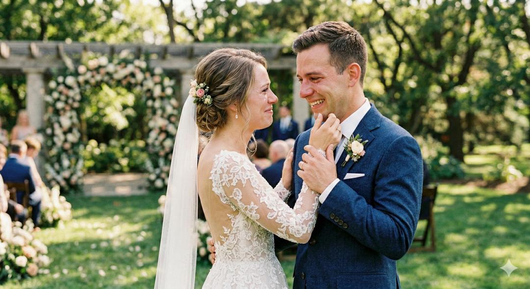 提示词: 一对新婚夫妇在婚礼上的First Look瞬间。新娘穿着洁白婚纱,从背后轻轻蒙住新郎的眼睛,新郎转过身来,两人相视而笑,眼中含泪。阳光透过树叶洒在他们身上,婚纱的蕾丝细节、新郎西装的面料纹理清晰可见。背景是模糊的草坪和鲜花拱门,画面充满幸福甜蜜的氛围。