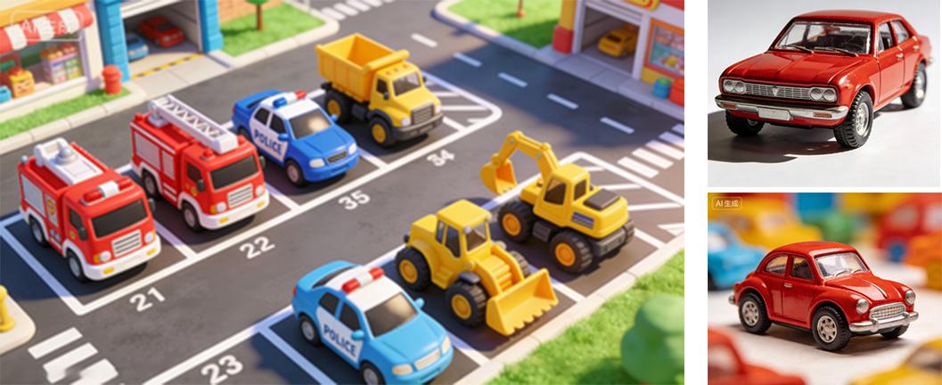 下面这个例子进一步体现了Nano Banana 2精准指令遵循特征。当我上传了三张图片,让Nano Banana 2将下面左图停车场中的小车替换为右图两个小车时,其在保持原图一致性的基础上将其中几辆小车替换,替换后的车辆与其他车辆的比例保持一致,车下的太阳光阴影也符合物理规律。