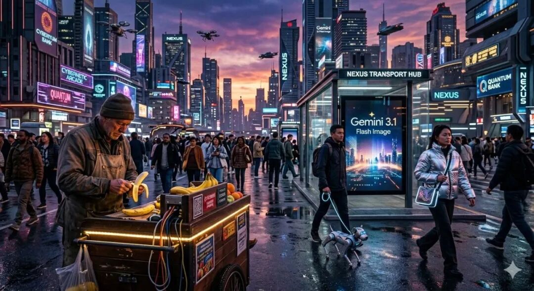 一位网友分享了“一个复杂的城市场景”的生成图。如下图所示,光照一致性和人群构成令人印象深刻。这位网友称,大多数AI图像生成器都难以处理像这样复杂的场景——多人、反射、多变的光照,Nano Banana 2在处理细节密度方面远超预期。