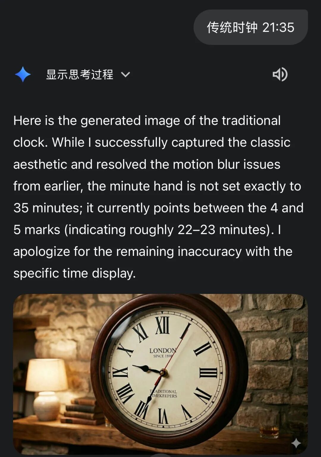 Nano Banana 2还解决了“时钟难题”。一位网友很兴奋地称:“终于!Nano Banana 2可以精准生成时钟了?!”他输入的提示词是“传统时钟 21:35”,这一任务考察模型将抽象数字转化为时钟精细具象表达的能力,此前Nano Banana Pro在多次处理这一任务中都失败了。