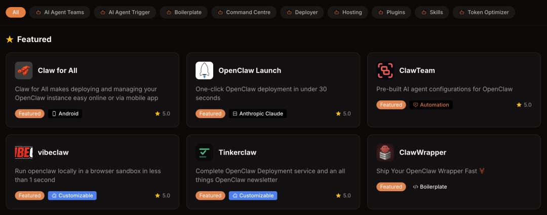 AI Agent Teams(Agent团队协同工作方案)、AI Agent Trigger(触发Agent执行任务的机制/工具)、Boilerplate(代码模板)、Command Centre(控制面板)、Deployer(部署工具)、Hosting(托管服务)、Token Optimizer(Token优化工具)、Skills(扩展特定功能的技能模块)、Plugins(增强OpenClaw能力的插件)。