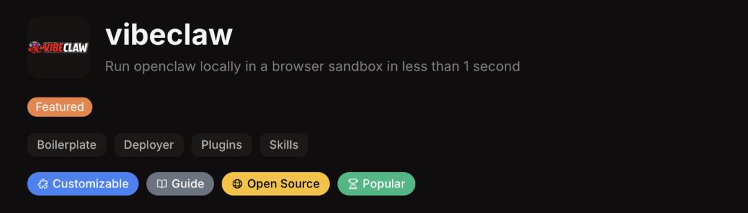 排在第四位的vibeclaw就更极限了,号称可以1秒内在浏览器沙箱中本地运行OpenClaw。