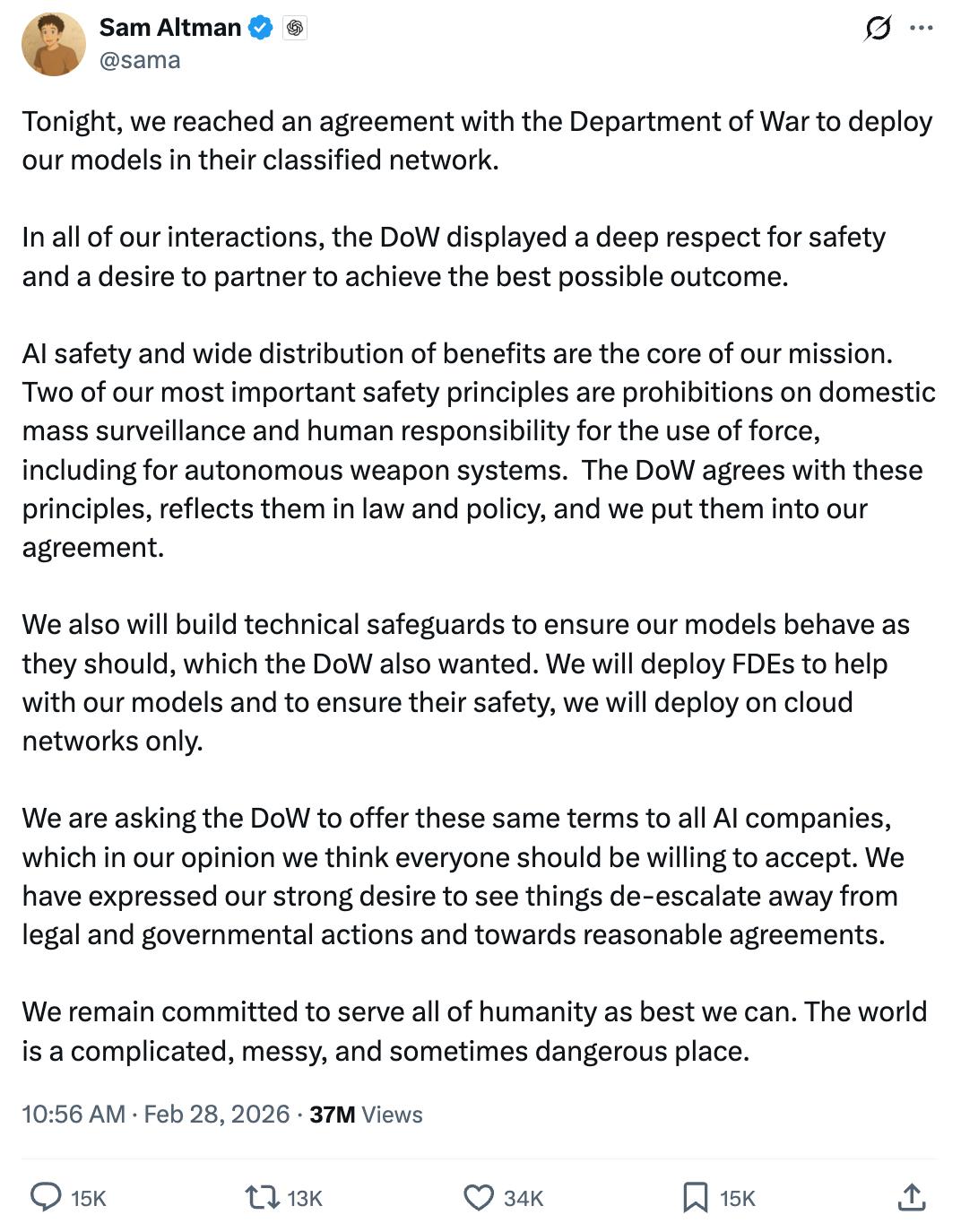 然而,就在阿尔特曼发表这些声明的同时,他正与五角大楼就一项新协议进行谈判。这项协议在Anthropic谈判破裂后几小时就对外宣布了。阿尔特曼连发三条一样的帖子,宣布OpenAI已与五角大楼达成协议,将模型部署到机密网络中。