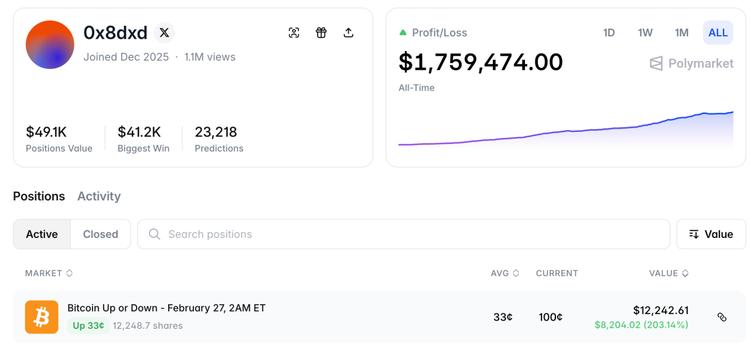 当人类交易员还在被恐惧与贪婪左右,一个名为“0x8dxd”的机器人账户,在Polymarket上悄悄完成了两万多次交易,盈利总和超过170万美元。