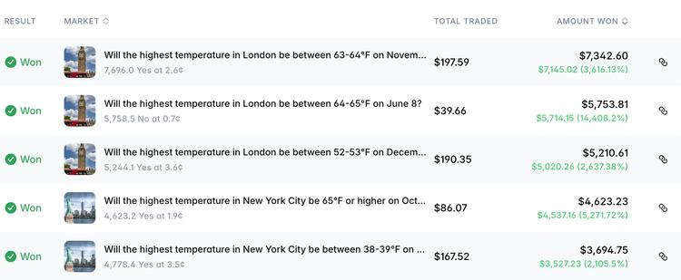 一个名为“automatedAItradingbot”的账户,2025年1月入驻Polymarket。它热衷于围绕天气预测下注,盈利超过7万美元。还有人发现,一个仅交易伦敦天气市场的机器人,在不到一年的时间里,把1000美元变成了2.4万美元。