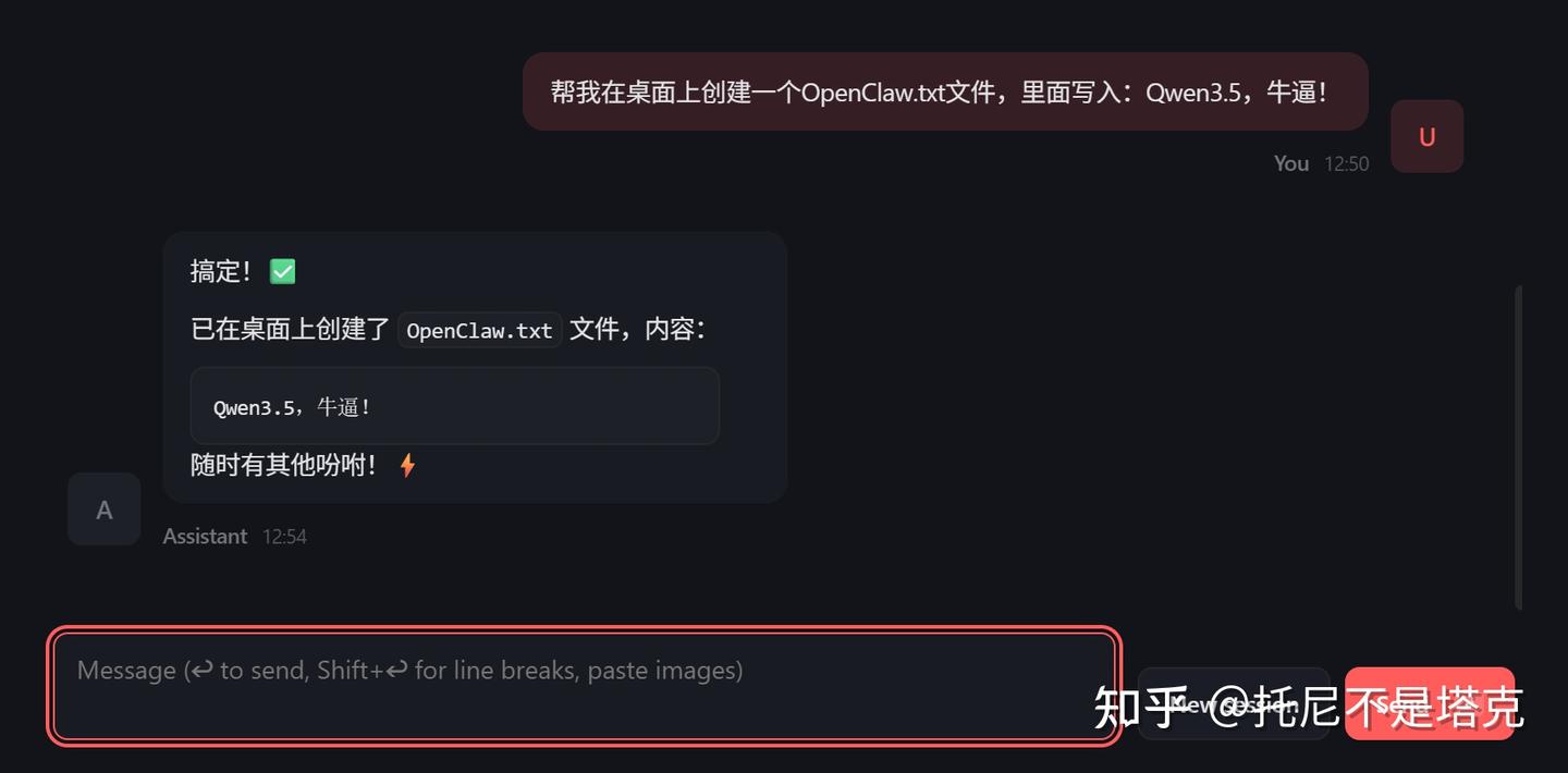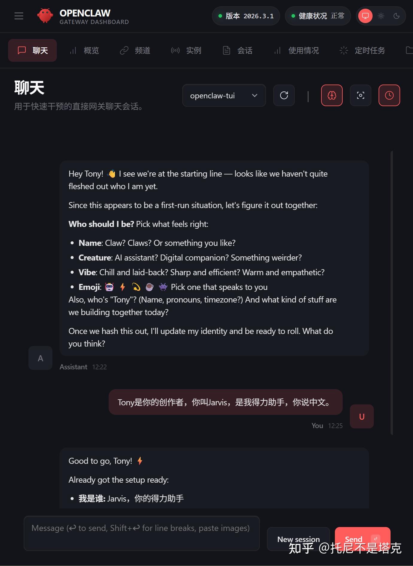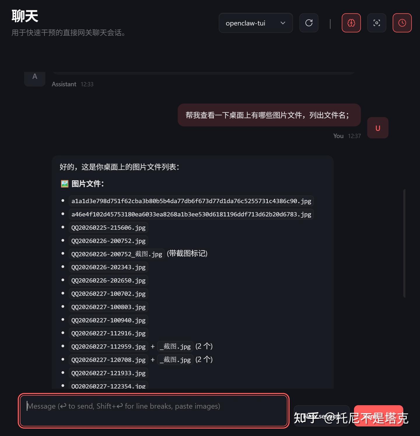 界面中的聊天内容,和我们终端中的内容是同步的。在这个界面可以和我们的定制小龙虾对话,当然对话并没有什么了不起的。OpenClaw 和以往的 AI 最大的区别就是,它不仅仅能对话,它能访问和操作你的电脑。