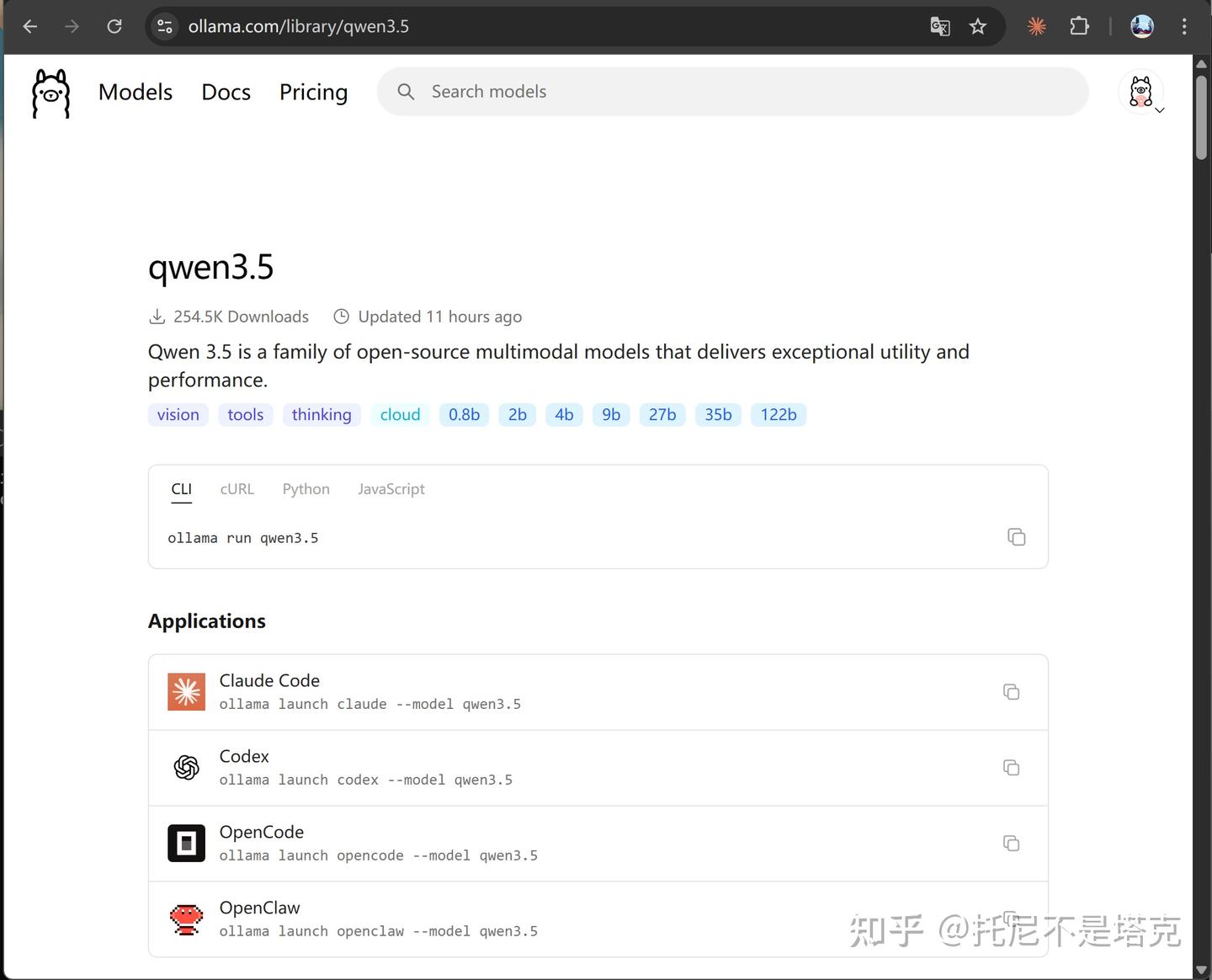 接下来我们就是下载模型Qwen3.5的模型了,打开 Ollama 的官网,找到 qwen3.5 的主页。