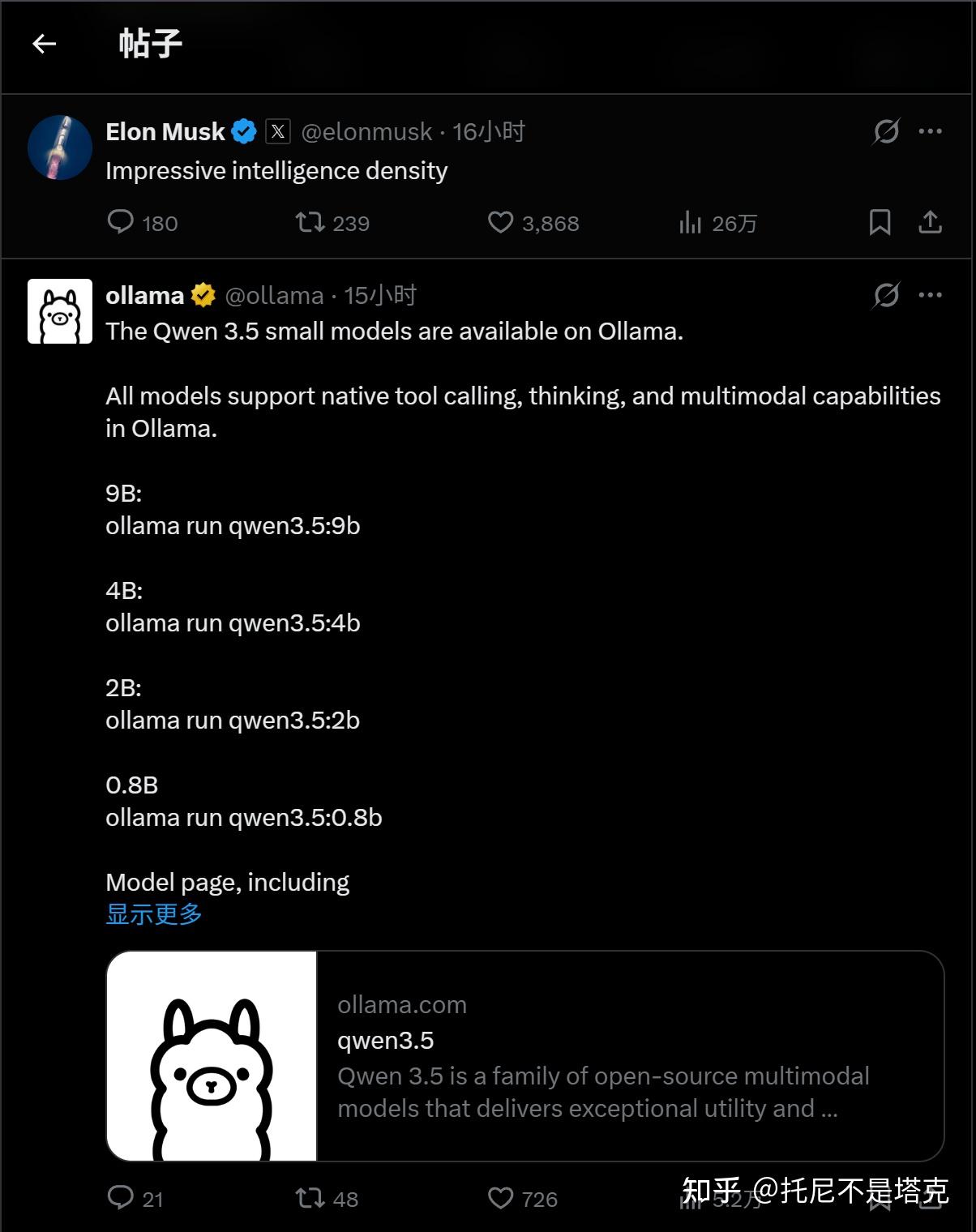 而榜二就是小羊驼了。Ollama 第一时间支持了 Qwen 3.5 各种尺寸的模型。