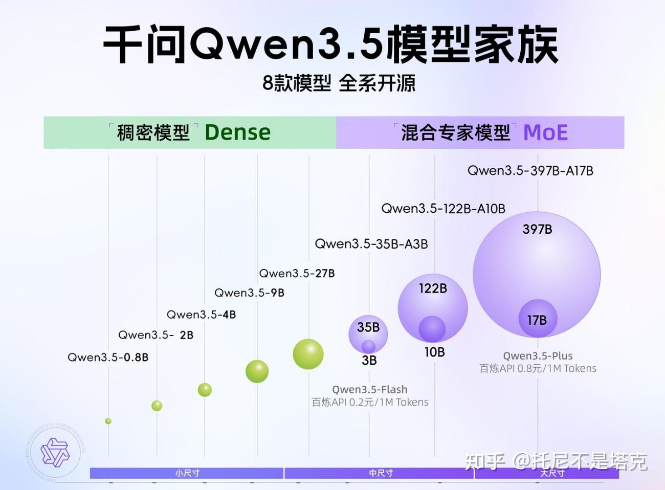从 0.8B 到 9B的稠密模型,再从 35B 到 397B 的混合专家模型,各种尺寸任君选择。