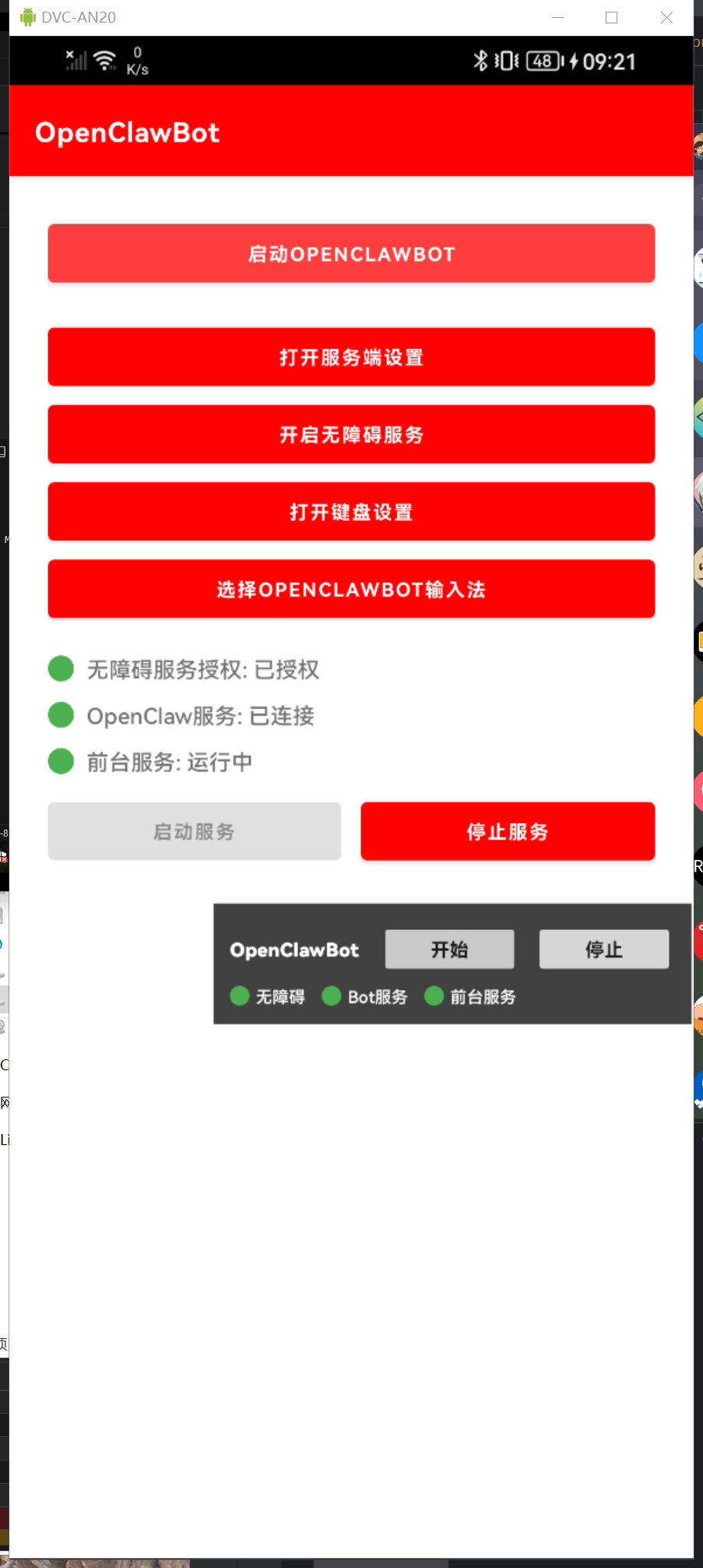 - 通过前台服务与悬浮窗展示运行状态并提供操作入口