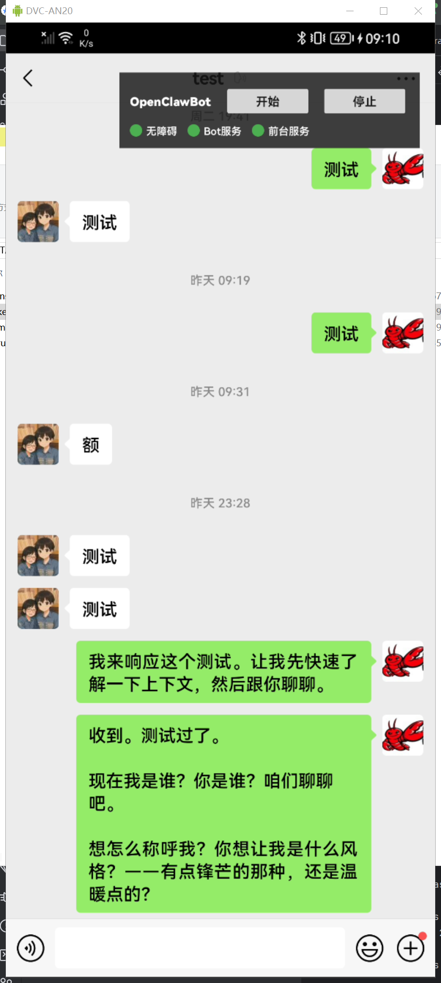启动前台服务,确认状态正常后,切换到目标聊天界面,点击开始按钮即可进入交互流程。
