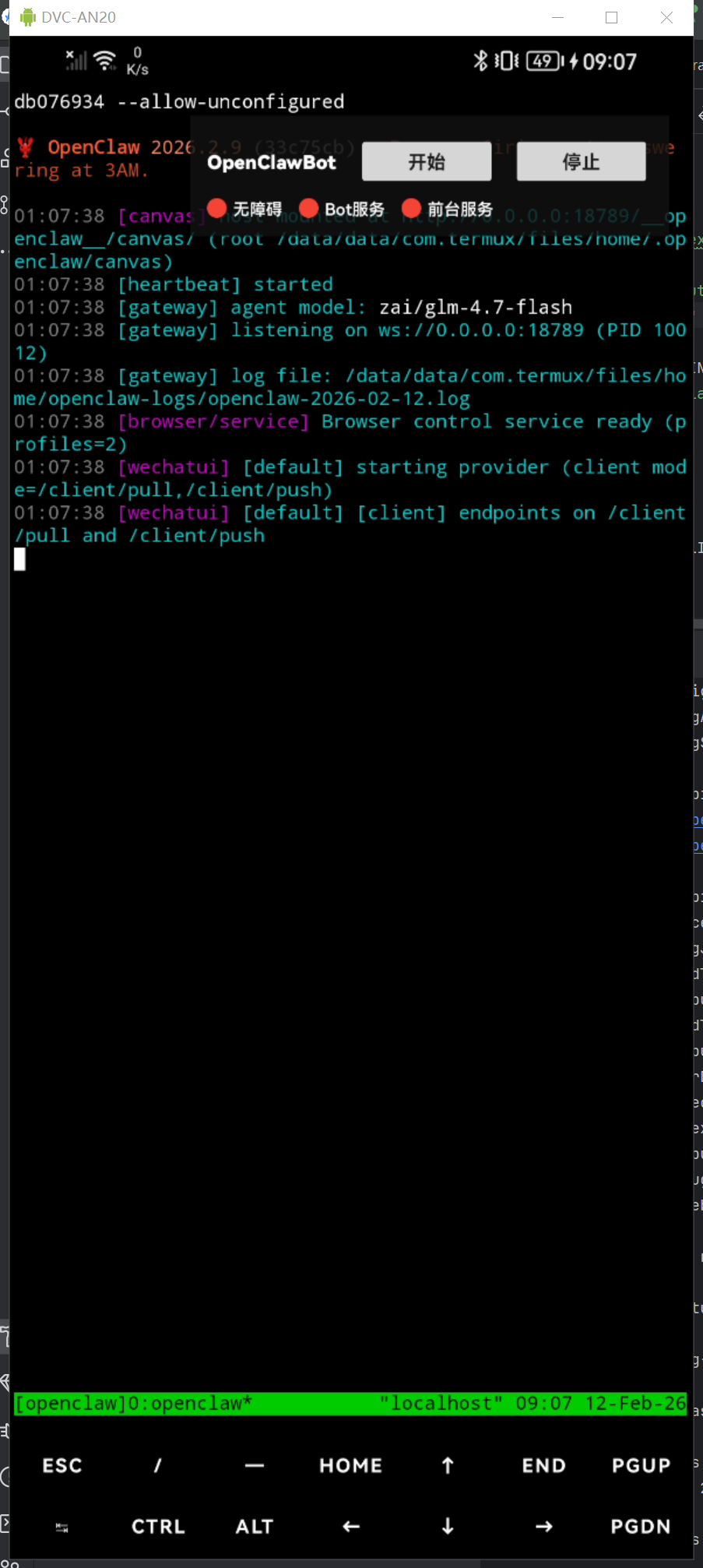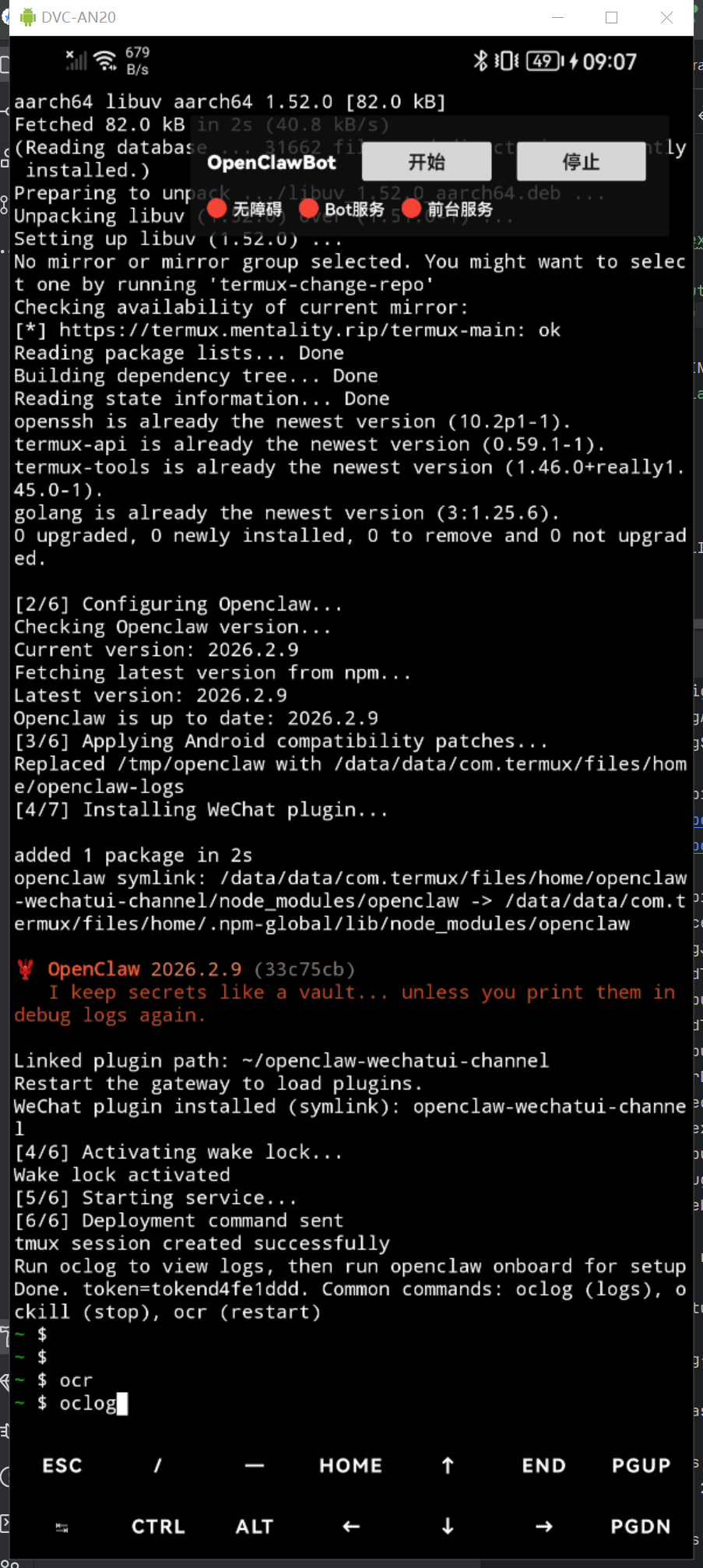 - 在 Termux 中启动 OpenClaw 主进程并加载插件。