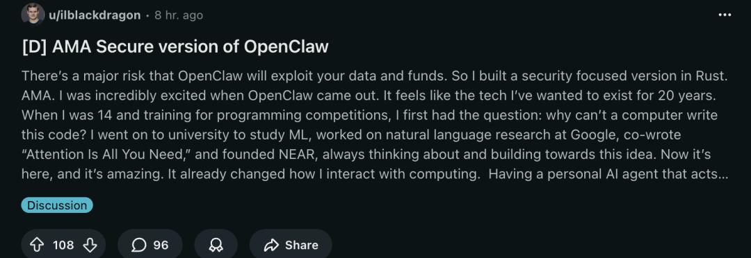 参考链接:[1]https://www.reddit.com/r/MachineLearning/comments/1rlnwsk/d_ama_secure_version_of_openclaw/