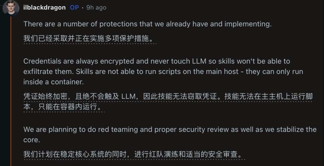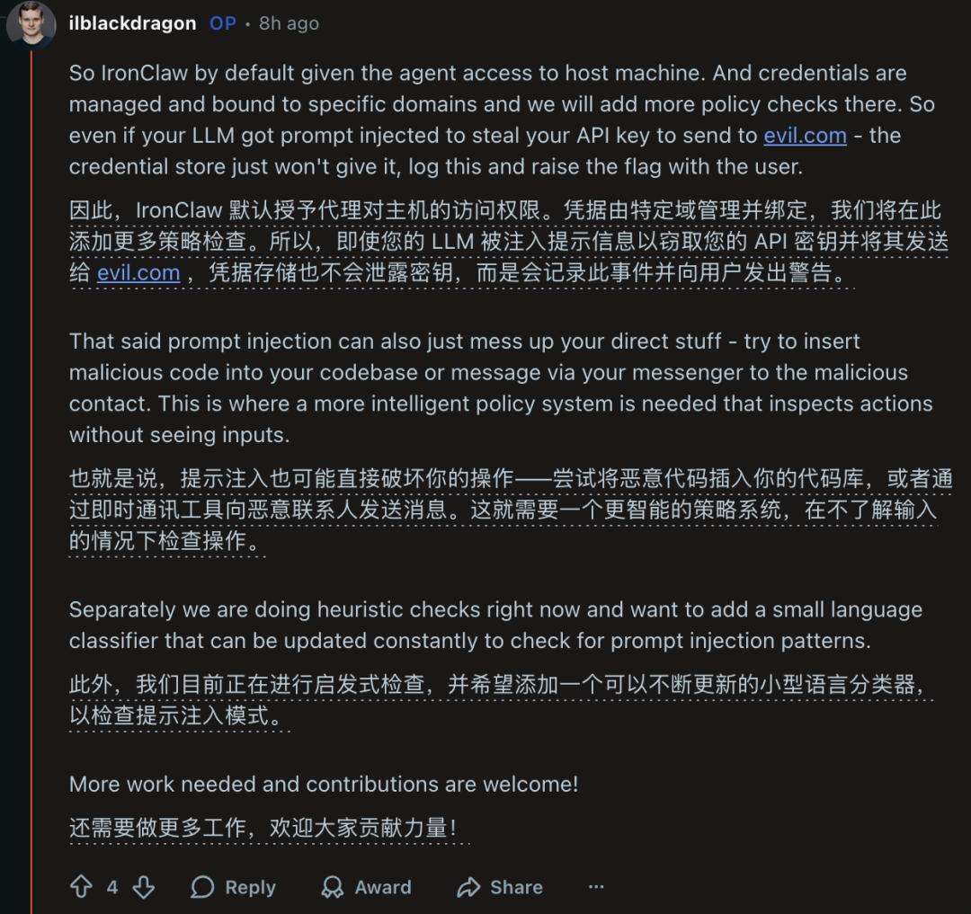 然而开发者社区还是不放心,毕竟OpenClaw有2000多个公开实例被攻击,以及存在大量恶意技能,IronClaw一旦走红会不会重蹈覆辙?