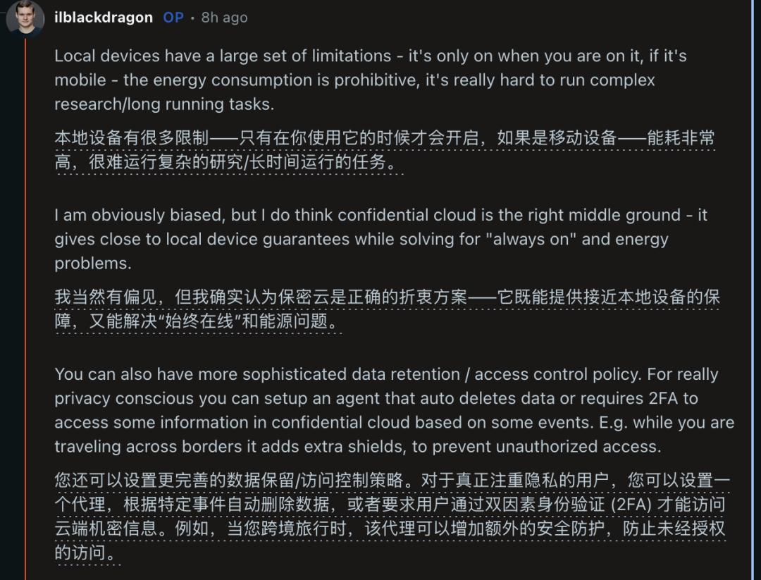 他认为机密云(confidential cloud)是目前的最优折中方案,既能提供接近本地设备的隐私保障,又能解决「永远在线」的问题。