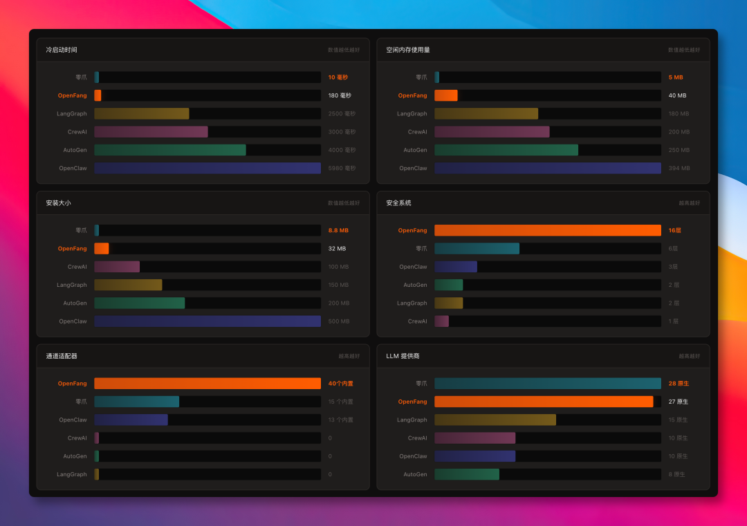 而在冷启动时间、内存占用、安装大小等性能测试数据上,OpenFang 夹在两者中间。