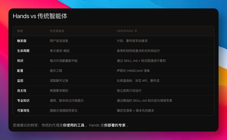 实现这套流程的核心,正是 OpenFang 这次带来的 Hands 预构建自主能力包。