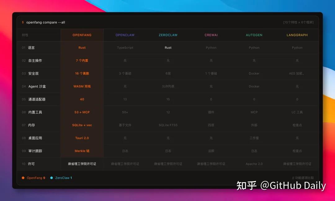 我们再来看一下,官方给出的 OpenFang 与 ZeroClaw 和 OpenClaw 详细对比。