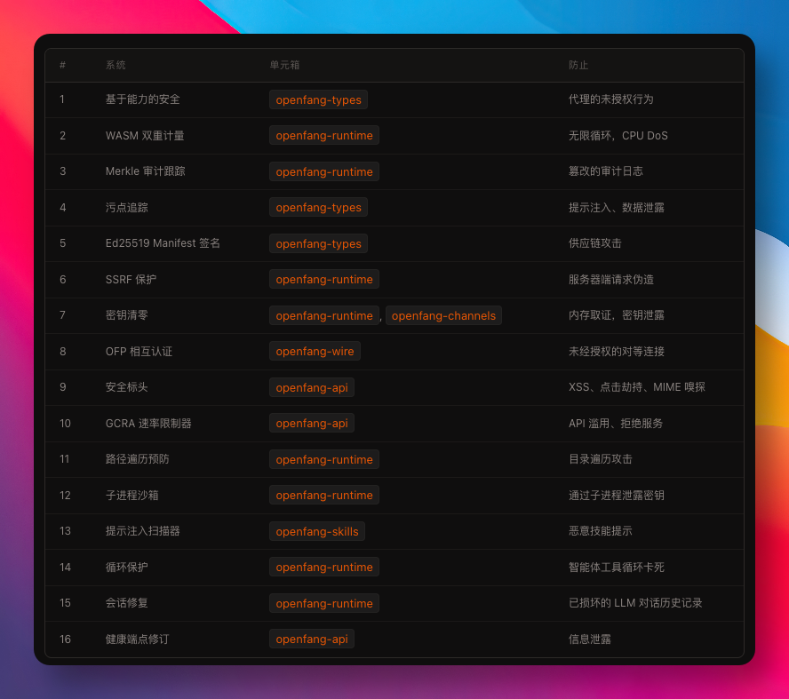 权限越大,安全就越关键,OpenFang 为此设计了 16 层独立安全机制,每一层单独运作。