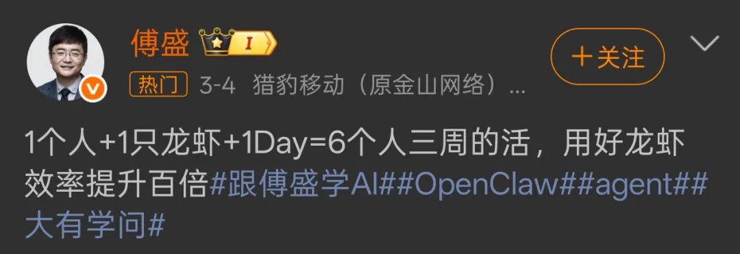 2026年春节,猎豹移动创始人傅盛在病床上,用8只“龙虾”完成了一个CEO+一个团队的全部工作:公众号日更6篇、给611名员工个性化拜年、推特百万阅读爆款、短视频30万+播放。