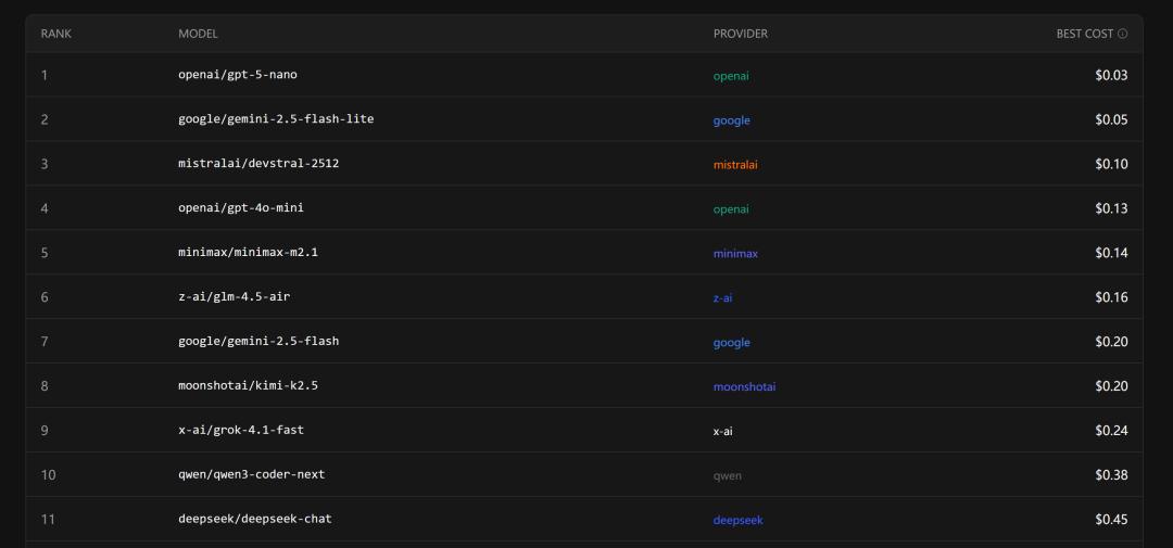 排第一的GPT-5-nano(专为轻量级、高性价比场景设计),输入价格低至0.05美元/百万tokens,输出价格低至0.40美元/百万tokens。