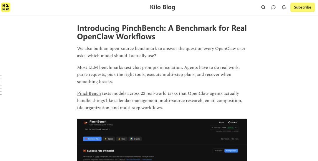而随着KiloClaw一起发布的,就有PinchBench这个智能体框架评测工具。