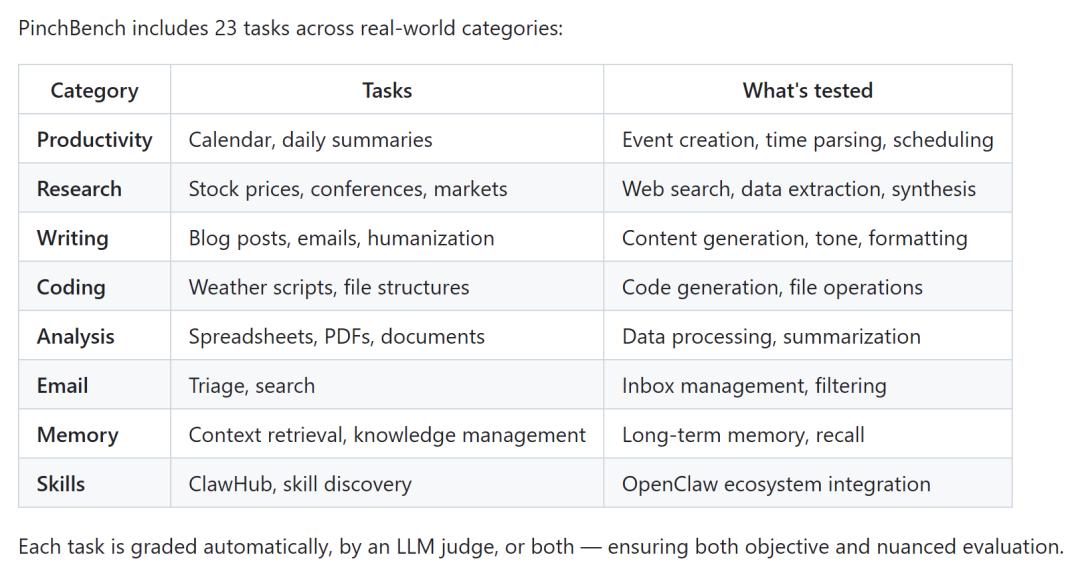 在评分机制上,PinchBench采用的是自动化检查+LLM评审的组合方式: