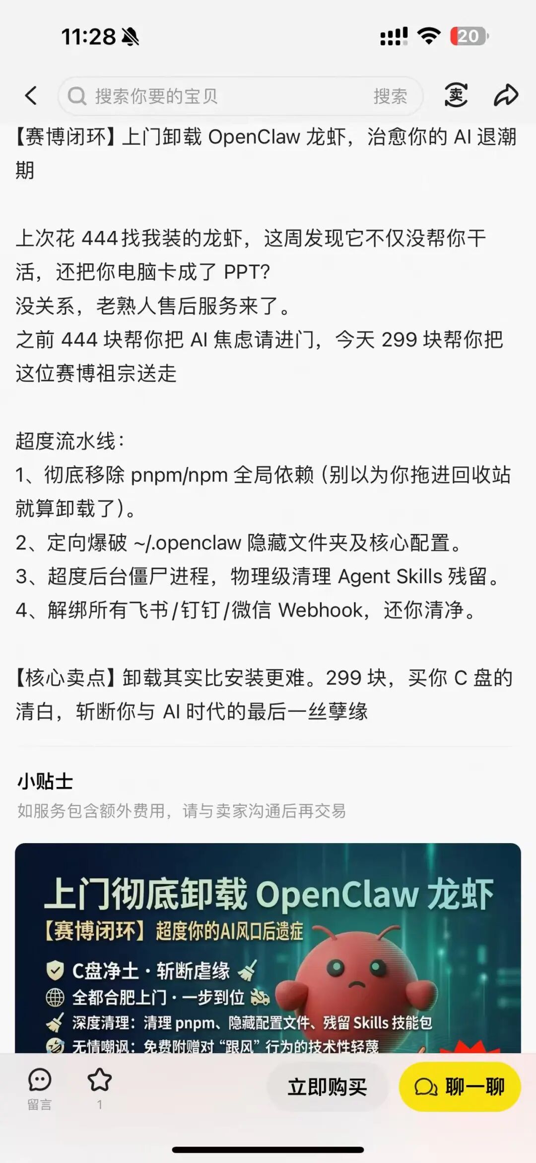 目前,这个🦞卸载产业链,已经遍布小红书、微信群、闲鱼等不同的社交平台。