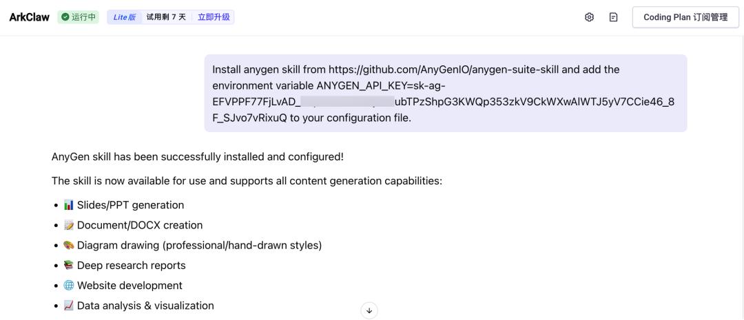 第一步,我接入的就是字节系的 Anygen。这样可以让我的 ArkClaw 拥有通用 Agent 的能力。