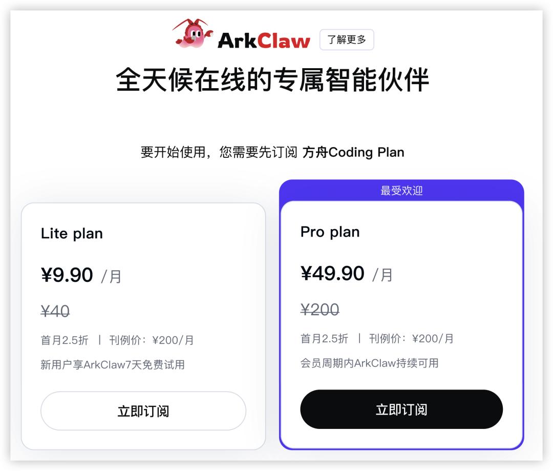 再看价格。方舟 Coding Plan Lite 9.9 元起步,附赠 7 天 ArkClaw 体验。Pro 版本 49 元/月,在订阅有效期内可以持续使用 ArkClaw。