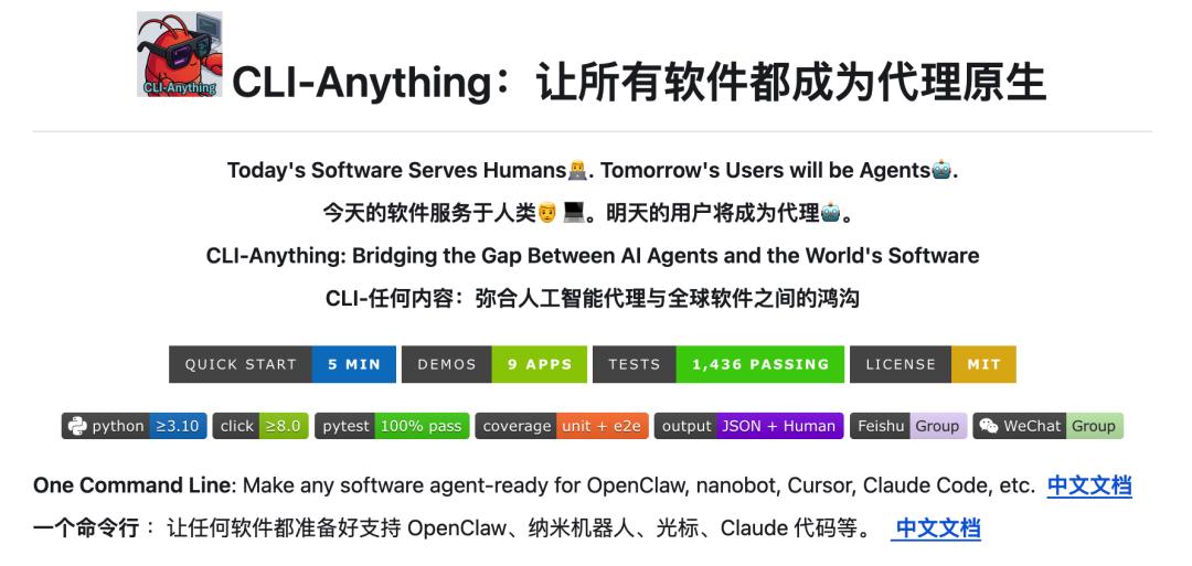 港大数据实验室也关注到这个趋势,于 9 号推出了一个开源工具,可以一键将现有软件转化为 AI 代理可调用的接口。