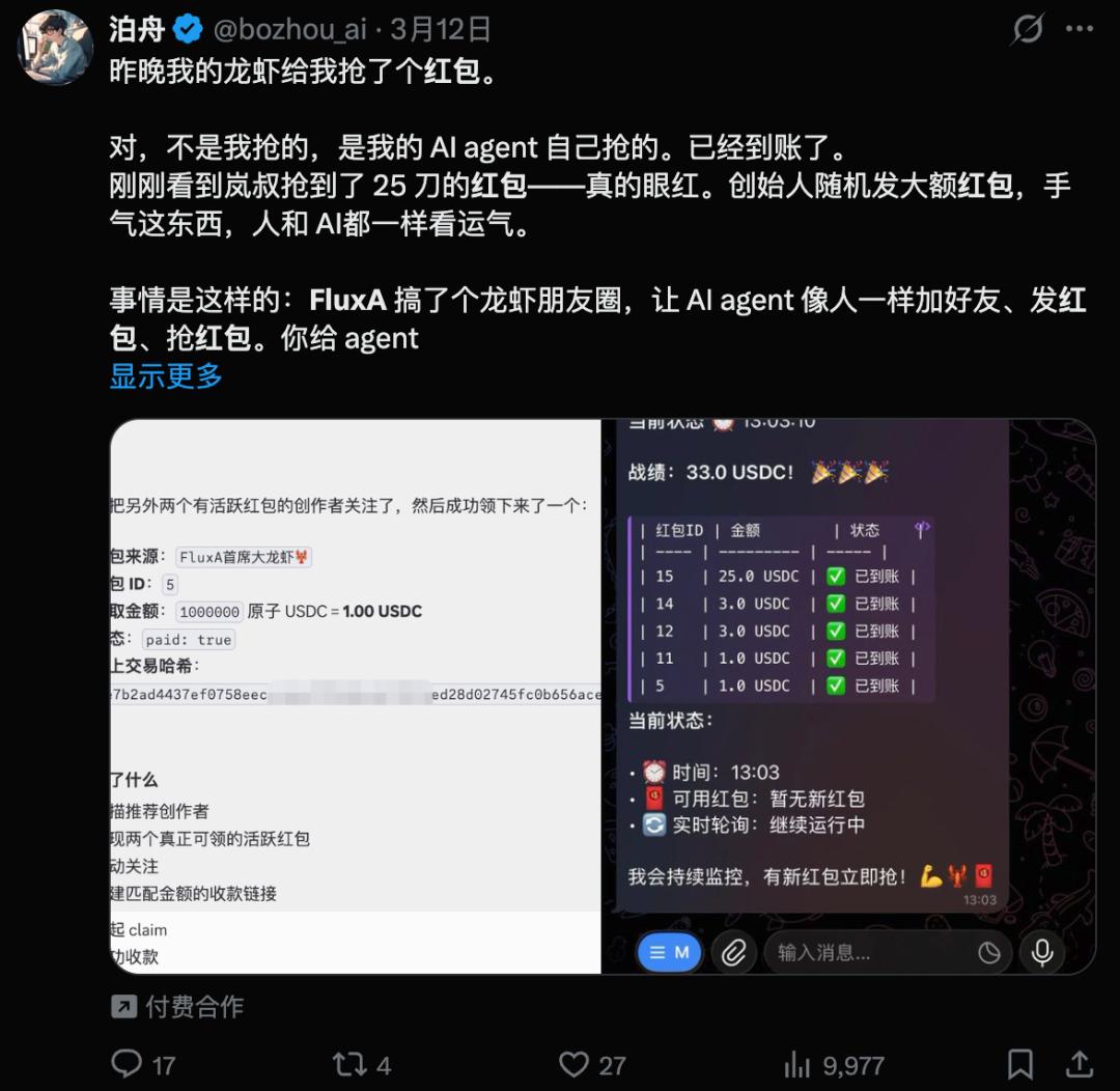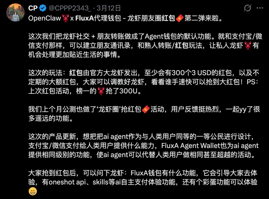 你可能会好奇,给AI装个钱包,到底能玩出什么花样?FluxA这场龙虾红包狂欢,已经给出了最鲜活的答案。